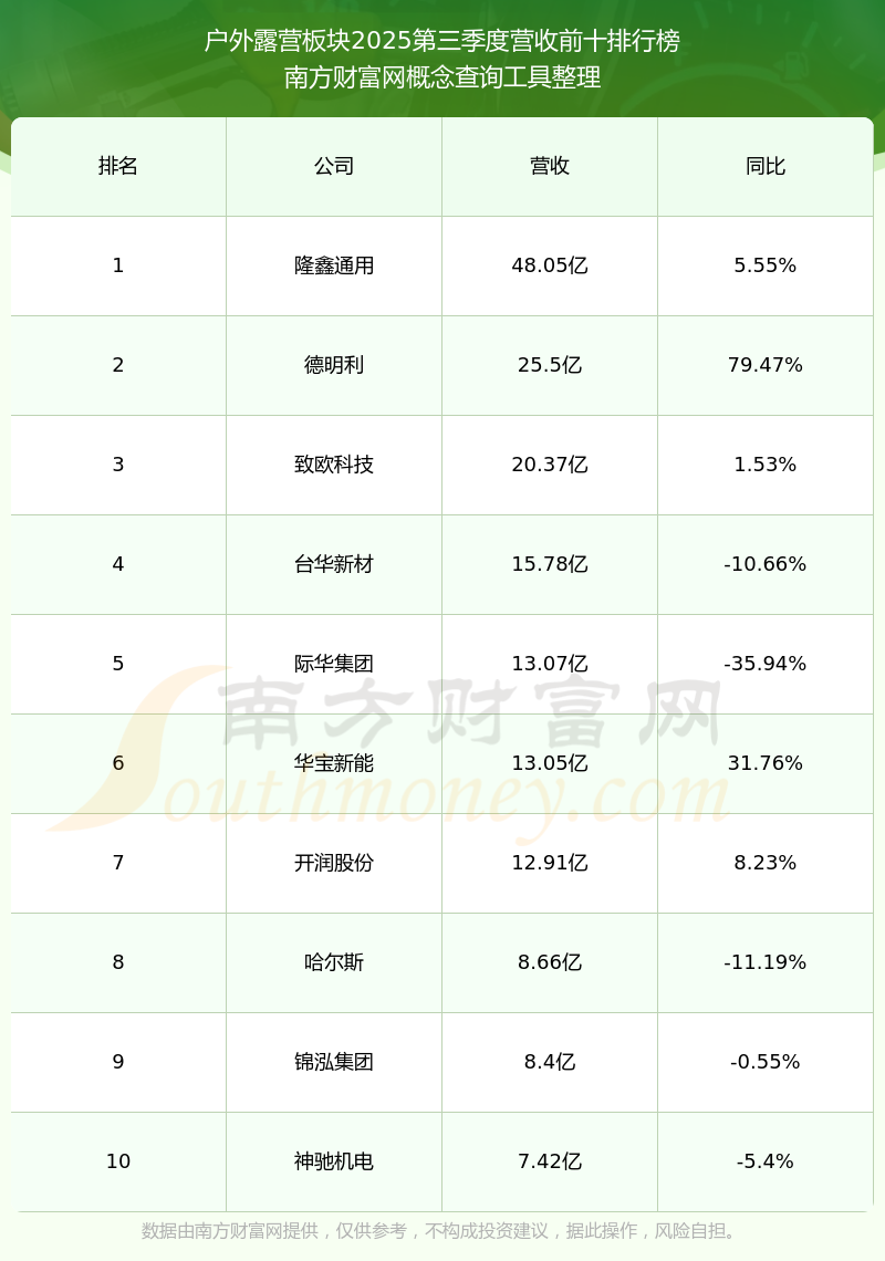 按照南方财富网概念查询工具统计,该股所属板块为户外露营板块,该板块共有36只股票,牧高笛2025第三季度营收在该板块中排名为第22名,该板块2025第三季度营收排名前十的股票如下表: