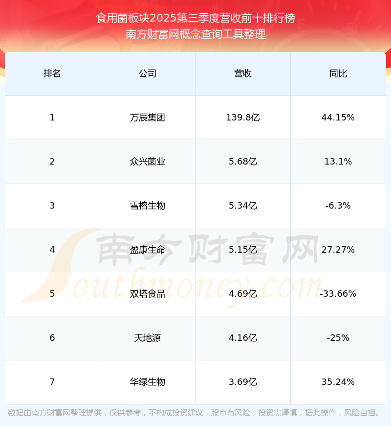 按照南方财富网概念查询工具统计,该股所属板块为食用菌板块,该板块共有7只股票,博闻科技2025第三季度营收在该板块中排名为第7名,该板块2025第三季度营收排名前十的股票如下表: