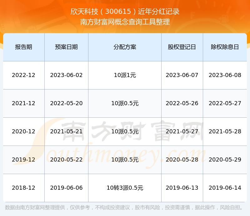 欣天科技最新一次公布的分红方案为10派1元。本次权益分派股权登记日为2023年6月7日,除权除息日为2023年6月8日,派息日为2023年6月8日。