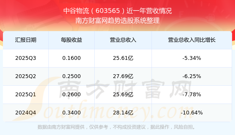 中谷物流发布2025年第三季度财报。实现总营收25.61亿元,同比增长-5.34%;扣非净利润同比增长65.37%至3.05亿元。