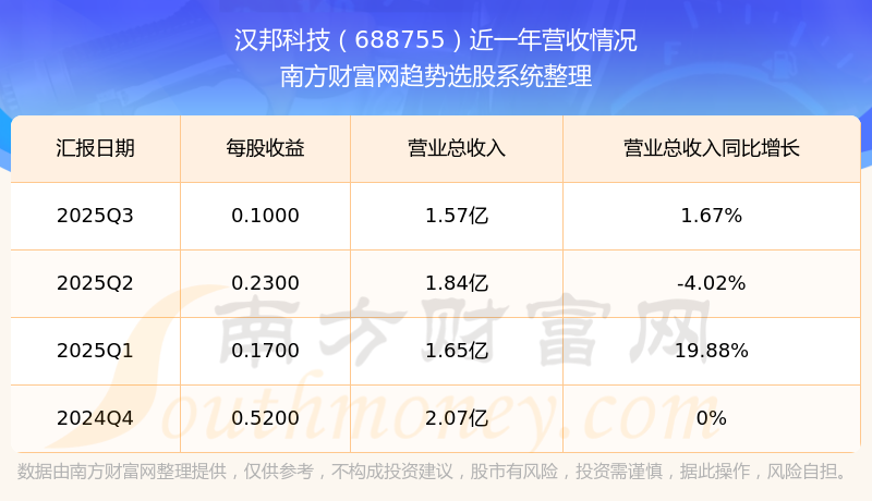 汉邦科技股票近一年营收情况如下表: