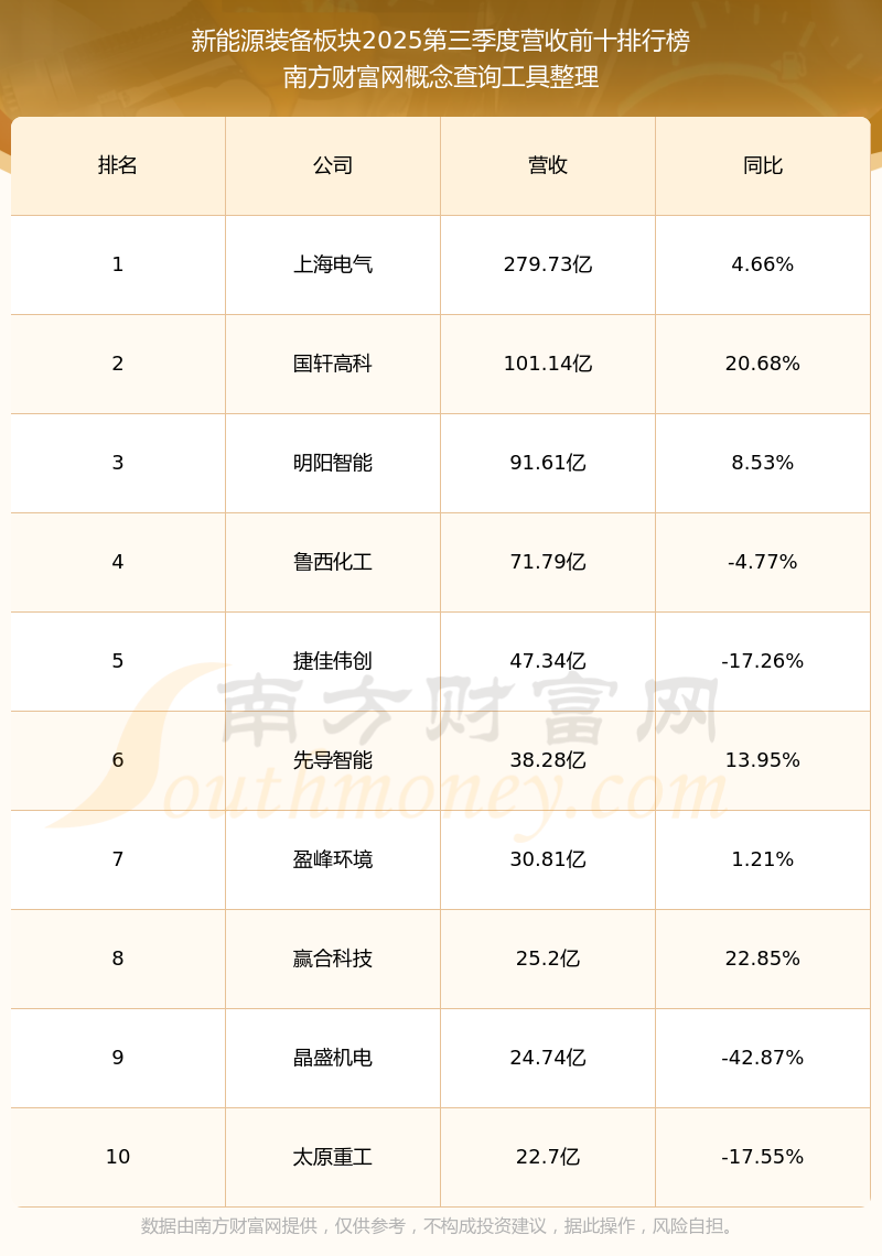 按照南方财富网概念查询工具统计,该股所属板块为新能源装备板块,该板块共有31只股票,南网科技2025第三季度营收在该板块中排名为第31名,该板块2025第三季度营收排名前十的股票如下表: