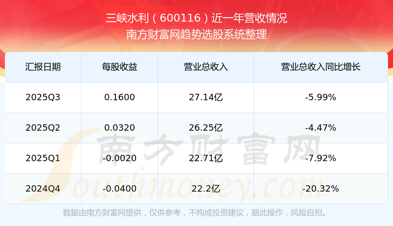 三峡水利披露了2025年第三季度财报。报告显示,三峡水利2025年第三季度实现营收27.14亿元,同比-5.99%;归母净利润3.03亿元,同比96.26%。