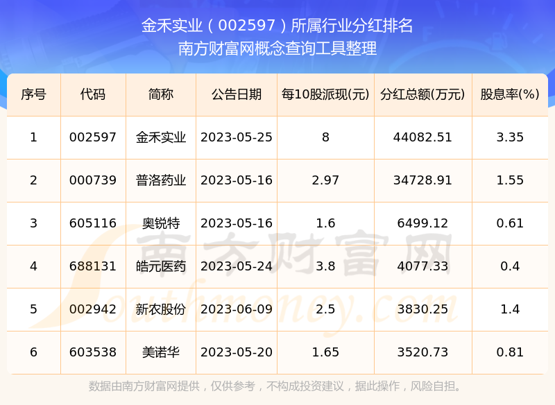 按照南方财富网趋势选股系统统计,金禾实业所属行业为食品添加剂行业,食品添加剂行业分红排名情况如下表: