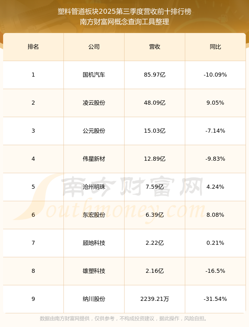 按照南方财富网概念查询工具统计,该股所属板块为塑料管道板块,该板块共有9只股票,凌云股份2025第三季度营收在该板块中排名为第2名,该板块2025第三季度营收排名前十的股票如下表: