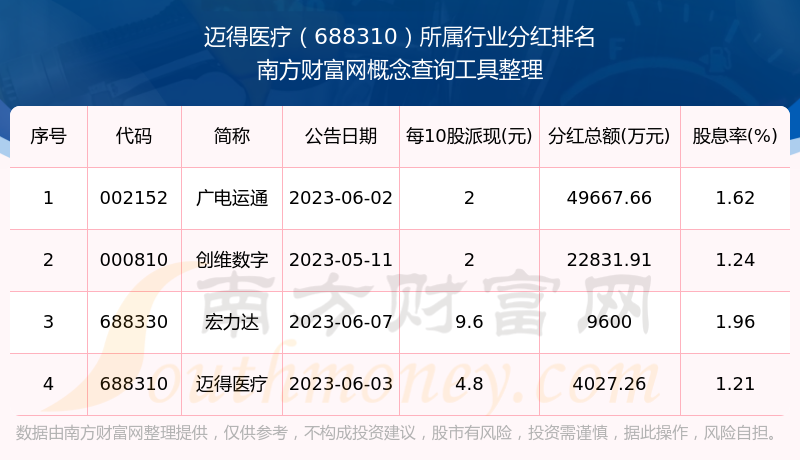 按照南方财富网趋势选股系统统计,迈得医疗所属行业为医用耗材行业,医用耗材行业分红排名情况如下表: