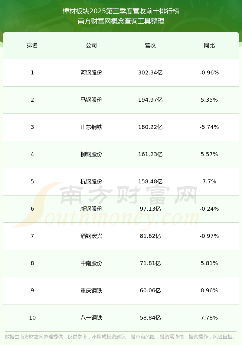 按照南方财富网概念查询工具统计,该股所属板块为棒材板块,该板块共有12只股票,酒钢宏兴2025第三季度营收在该板块中排名为第7名,该板块2025第三季度营收排名前十的股票如下表: