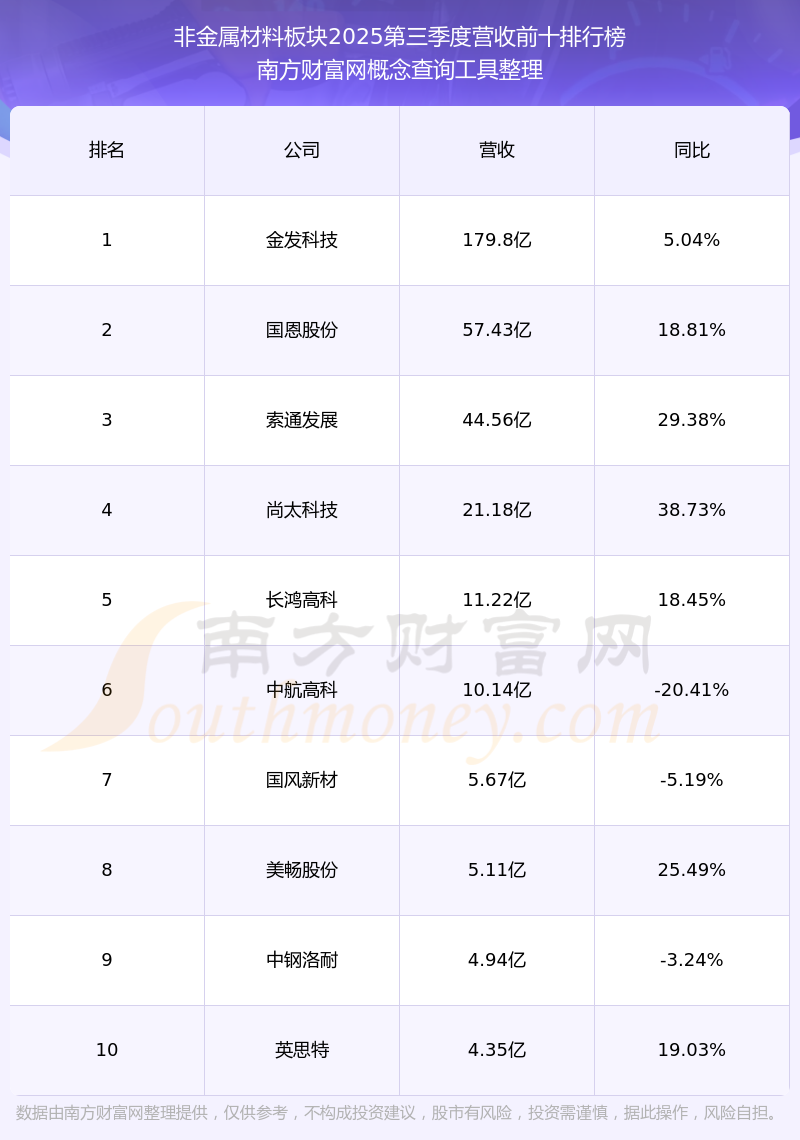 按照南方财富网概念查询工具统计,该股所属板块为非金属材料板块,该板块共有23只股票,黄河旋风2025第三季度营收在该板块中排名为第23名,该板块2025第三季度营收排名前十的股票如下表: