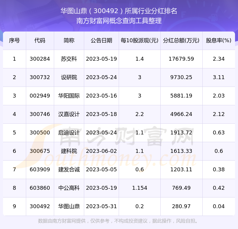 按照南方财富网趋势选股系统统计,华图山鼎所属行业为工程咨询服务行业,工程咨询服务行业分红排名情况如下表:
