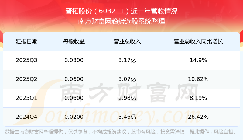 财报显示,2025年第三季度晋拓股份营收3.17亿元,同比增长14.9%,净利润2309.56万元,同比增长81.1%。