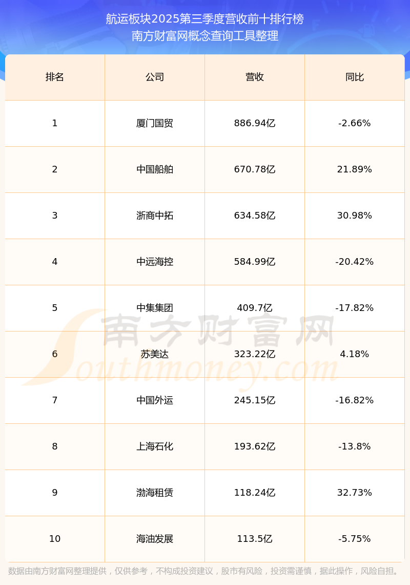 按照南方财富网概念查询工具统计,该股所属板块为航运板块,该板块共有89只股票,宁波远洋2025第三季度营收在该板块中排名为第46名,该板块2025第三季度营收排名前十的股票如下表:
