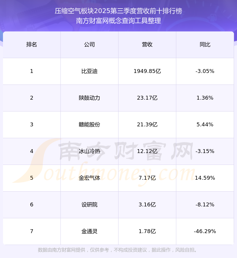 按照南方财富网概念查询工具统计,该股所属板块为压缩空气板块,该板块共有7只股票,物产环能2025第三季度营收在该板块中排名为第7名,该板块2025第三季度营收排名前十的股票如下表: