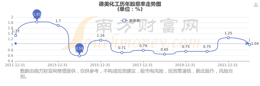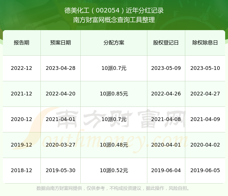 德美化工最新一次公布的分红方案为10派0.7元。本次权益分派股权登记日为2023年5月9日,除权除息日为2023年5月10日,派息日为2023年5月10日。