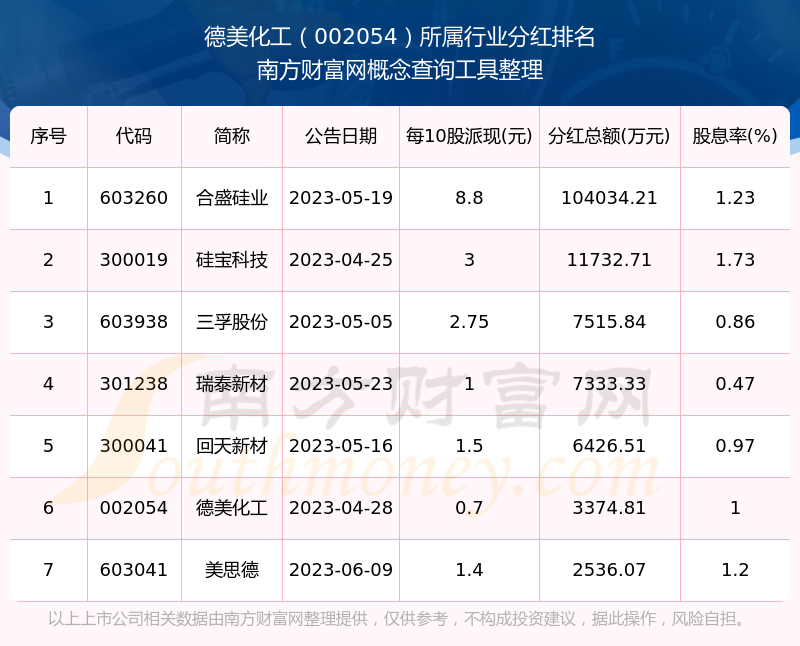 按照南方财富网趋势选股系统统计,德美化工所属行业为化学制品行业,化学制品行业分红排名情况如下表: