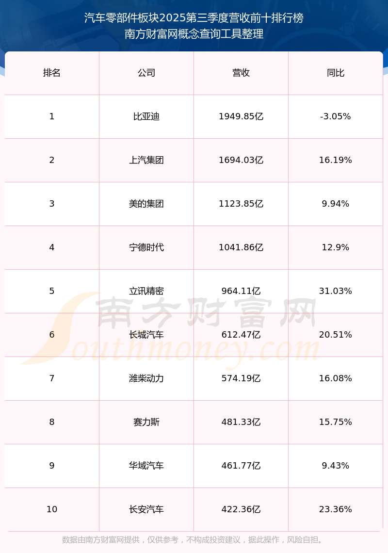 按照南方财富网概念查询工具统计,该股所属板块为汽车零部件板块,该板块共有570只股票,金杯汽车2025第三季度营收在该板块中排名为第184名,该板块2025第三季度营收排名前十的股票如下表: