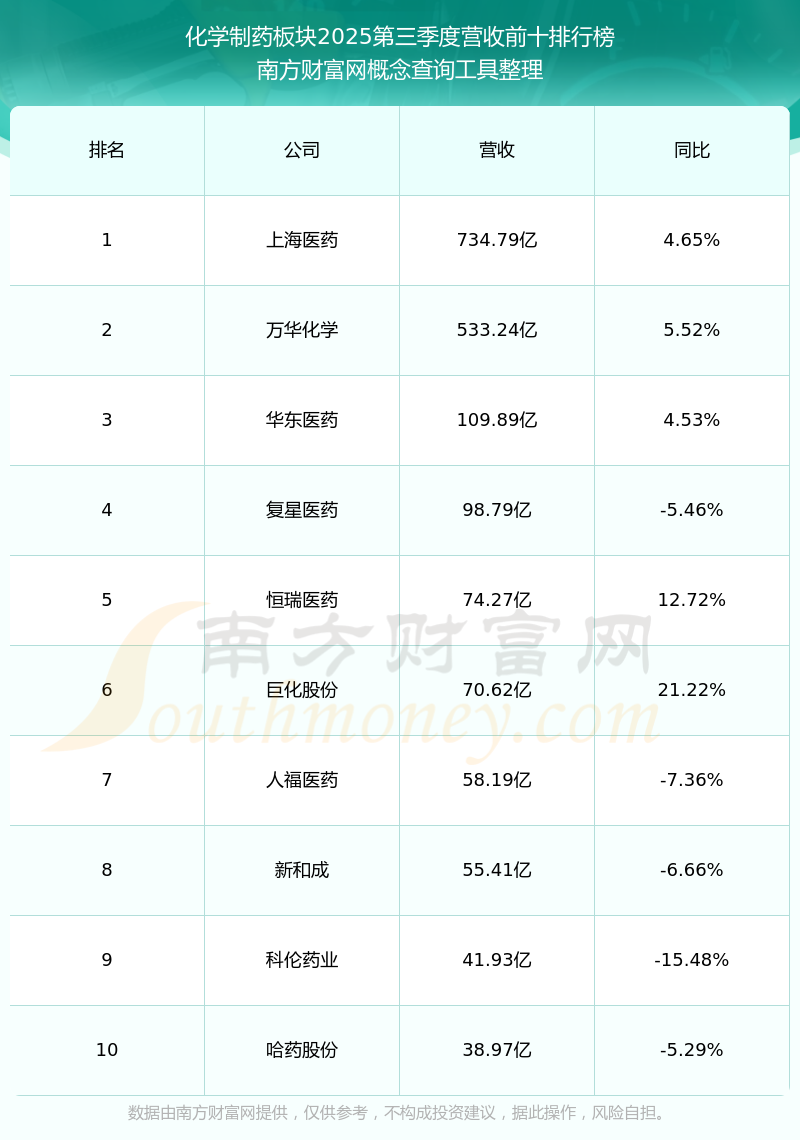 按照南方财富网概念查询工具统计,该股所属板块为化学制药板块,该板块共有175只股票,诚意药业2025第三季度营收在该板块中排名为第127名,该板块2025第三季度营收排名前十的股票如下表: