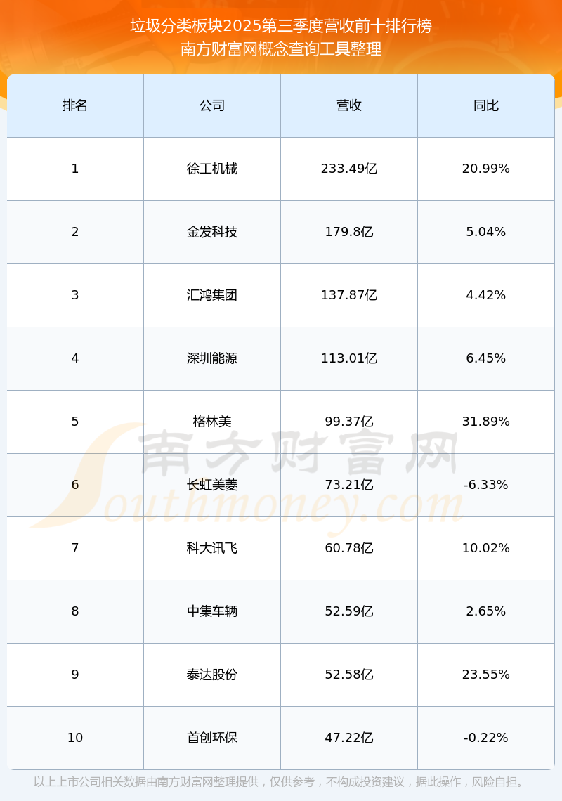 按照南方财富网概念查询工具统计,该股所属板块为垃圾分类板块,该板块共有142只股票,龙净环保2025第三季度营收在该板块中排名为第14名,该板块2025第三季度营收排名前十的股票如下表: