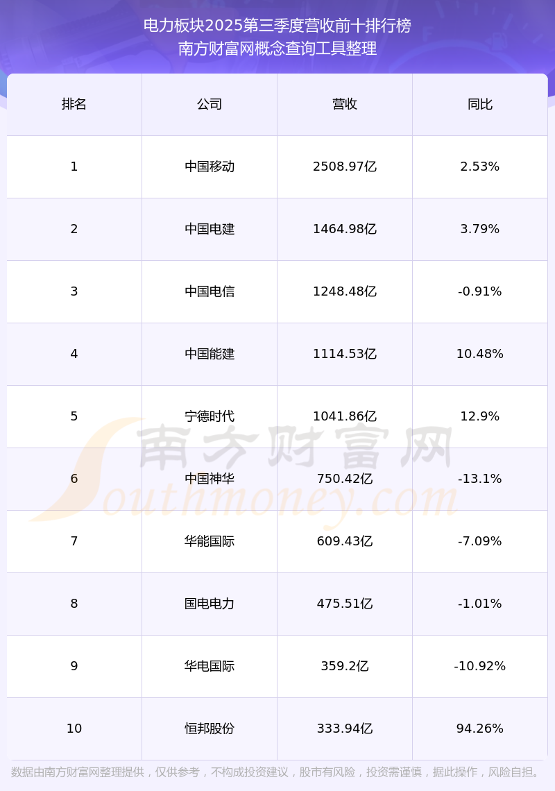 按照南方财富网概念查询工具统计,该股所属板块为电力板块,该板块共有237只股票,恒盛能源2025第三季度营收在该板块中排名为第201名,该板块2025第三季度营收排名前十的股票如下表: