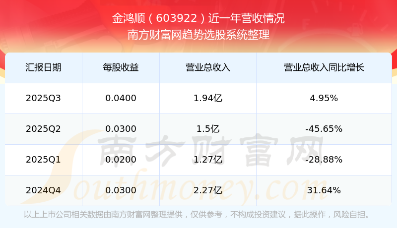 A股上市公司金鸿顺(代码:603922)发布2025年第三季度财报,公司2025年第三季度归属于上市公司股东的净利润为759.84万元,净利润同比增长341.43%,环比增长67.33%。