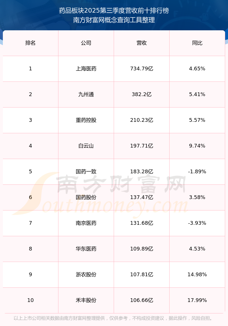 按照南方财富网概念查询工具统计,该股所属板块为药品板块,该板块共有278只股票,吉贝尔2025第三季度营收在该板块中排名为第193名,该板块2025第三季度营收排名前十的股票如下表: