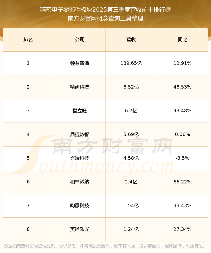 按照南方财富网概念查询工具统计,该股所属板块为精密电子零部件板块,该板块共有8只股票,昀冢科技2025第三季度营收在该板块中排名为第7名,该板块2025第三季度营收排名前十的股票如下表: