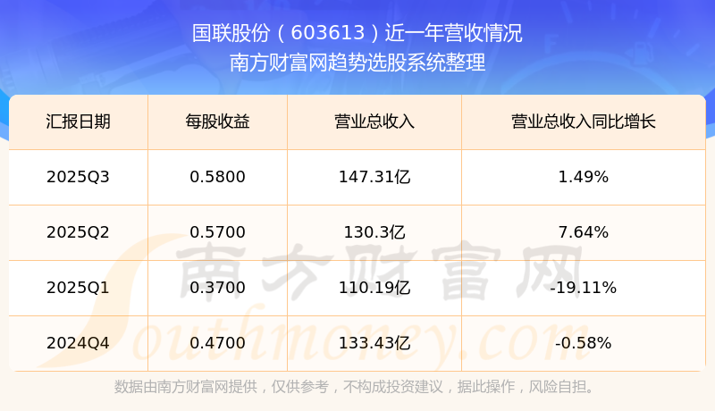 国联股份(603613)披露2025年第三季度报告,报告期实现营收147.31亿元,同比1.49%;归母净利润4.21亿元,同比3.31%;扣非净利润3.87亿元,同比-3.14%。