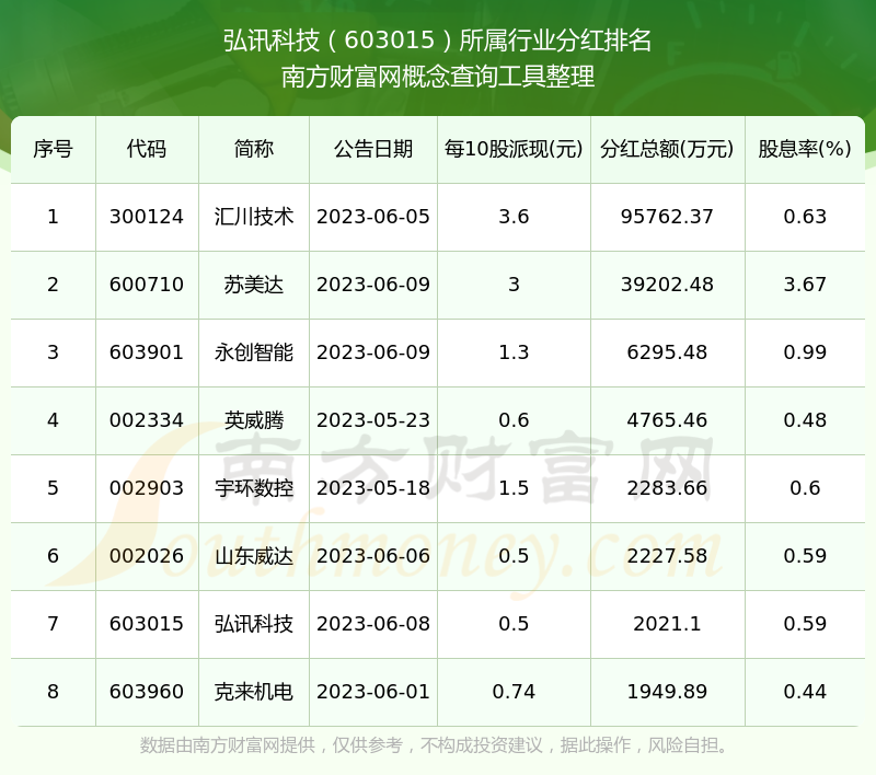 按照南方财富网趋势选股系统统计,弘讯科技所属行业为智能机器行业,智能机器行业分红排名情况如下表: