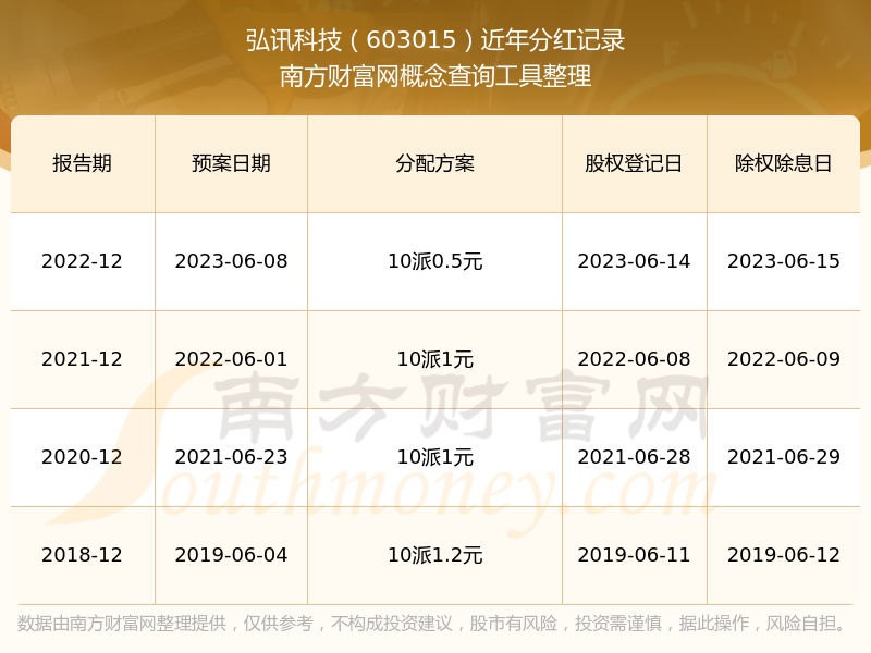 弘讯科技最新一次公布的分红方案为10派0.5元。本次权益分派股权登记日为2023年6月14日,除权除息日为2023年6月15日,派息日为2023年6月15日。