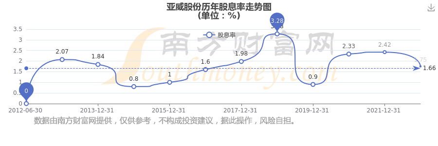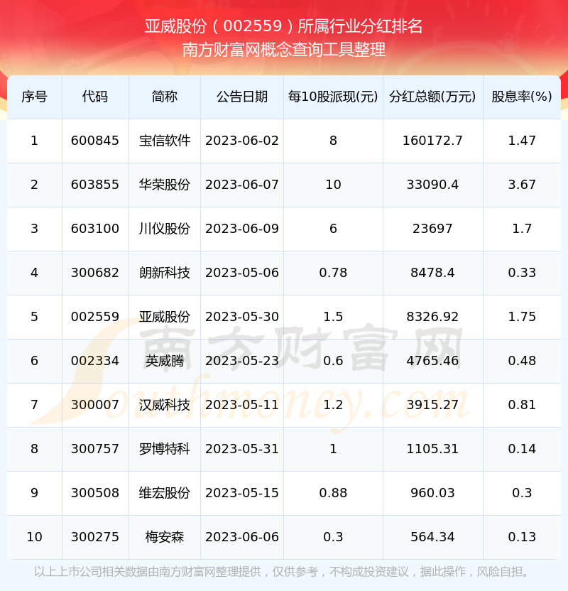 亚威股份最新一次公布的分红方案为10派1.5元。本次权益分派股权登记日为2023年6月5日,除权除息日为2023年6月6日,派息日为2023年6月6日。