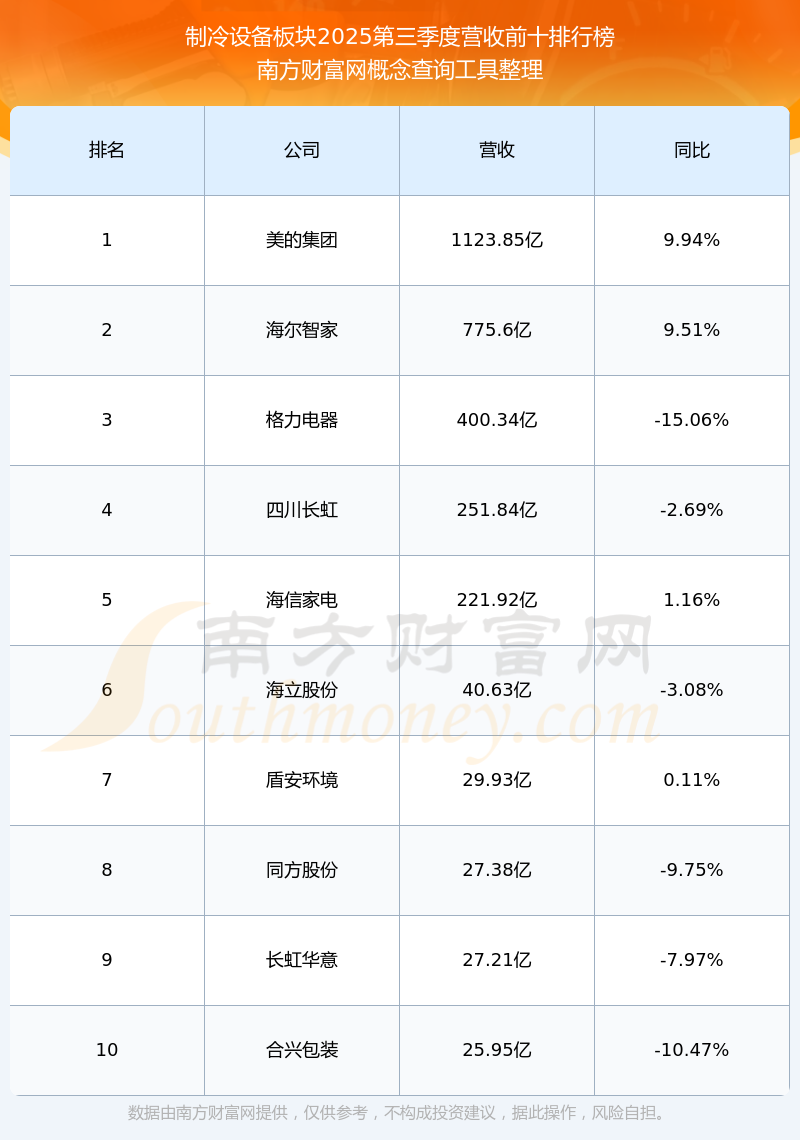 按照南方财富网概念查询工具统计,该股所属板块为制冷设备板块,该板块共有39只股票,海立股份2025第三季度营收在该板块中排名为第6名,该板块2025第三季度营收排名前十的股票如下表: