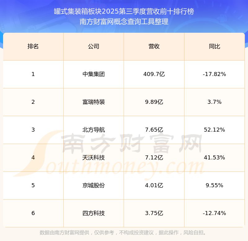 按照南方财富网概念查询工具统计,该股所属板块为罐式集装箱板块,该板块共有6只股票,四方科技2025第三季度营收在该板块中排名为第6名,该板块2025第三季度营收排名前十的股票如下表: