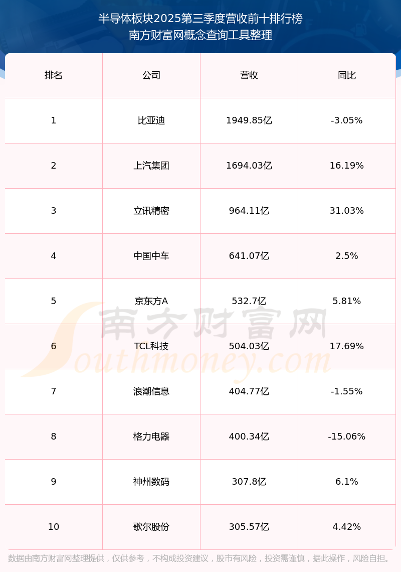 按照南方财富网概念查询工具统计,该股所属板块为半导体板块,该板块共有530只股票,京运通2025第三季度营收在该板块中排名为第190名,该板块2025第三季度营收排名前十的股票如下表: