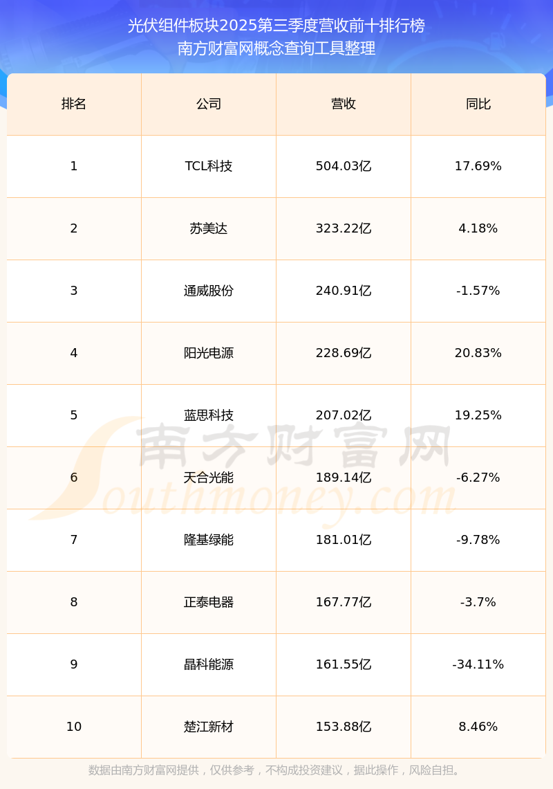 按照南方财富网概念查询工具统计,该股所属板块为光伏组件板块,该板块共有109只股票,晶科能源2025第三季度营收在该板块中排名为第9名,该板块2025第三季度营收排名前十的股票如下表: