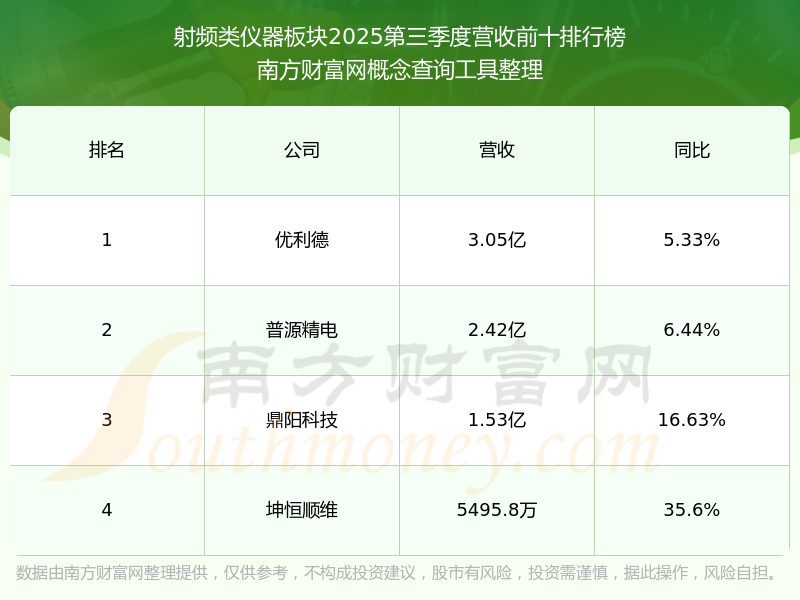 按照南方财富网概念查询工具统计,该股所属板块为射频类仪器板块,该板块共有4只股票,普源精电2025第三季度营收在该板块中排名为第2名,该板块2025第三季度营收排名前十的股票如下表: