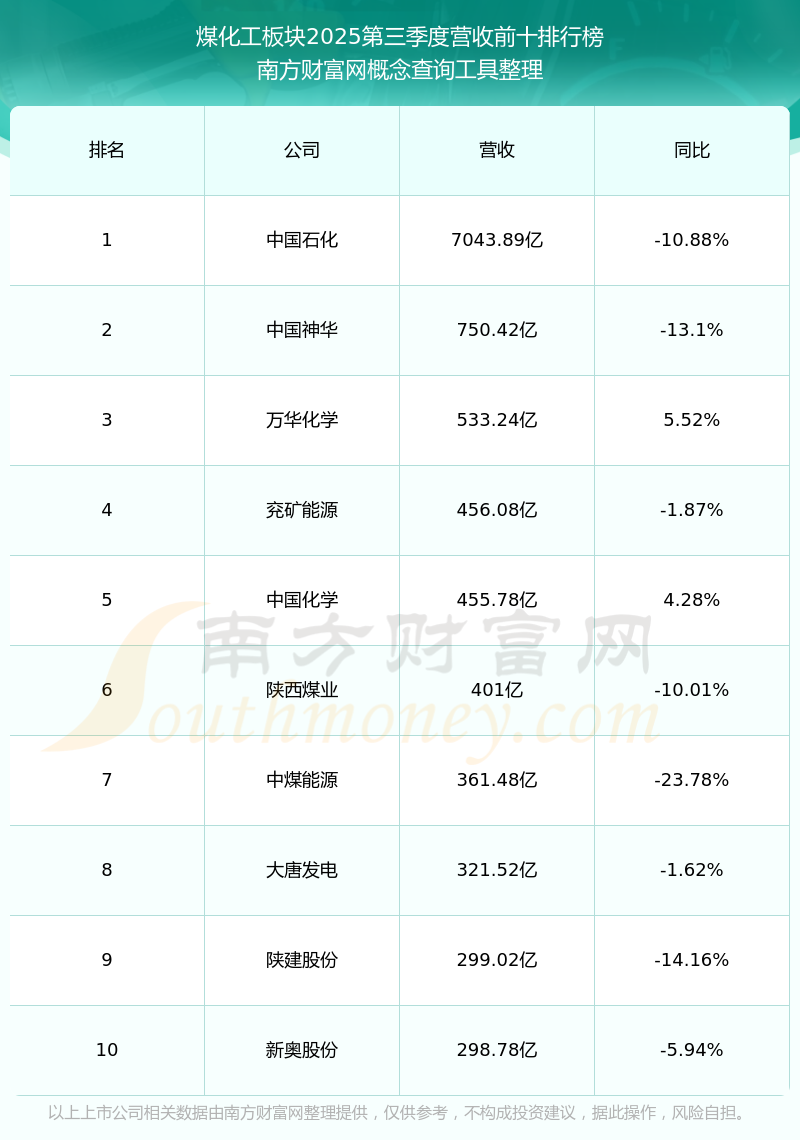 按照南方财富网概念查询工具统计,该股所属板块为煤化工板块,该板块共有121只股票,淮河能源2025第三季度营收在该板块中排名为第27名,该板块2025第三季度营收排名前十的股票如下表: