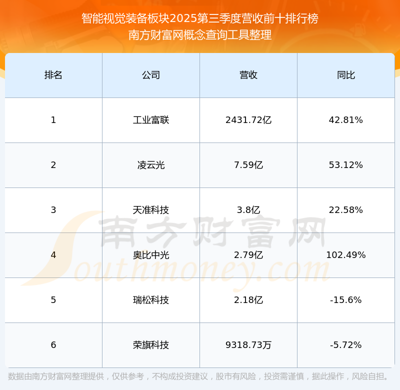 按照南方财富网概念查询工具统计,该股所属板块为智能视觉装备板块,该板块共有6只股票,凌云光2025第三季度营收在该板块中排名为第2名,该板块2025第三季度营收排名前十的股票如下表: