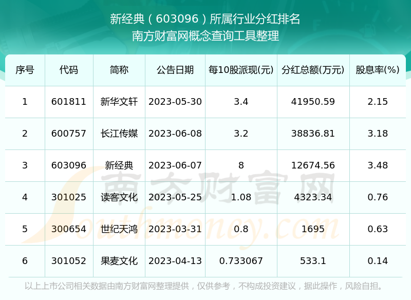 按照南方财富网趋势选股系统统计,新经典所属行业为图书行业,图书行业分红排名情况如下表: