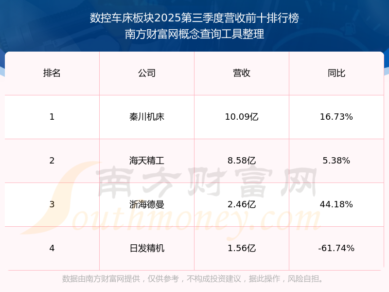 按照南方财富网概念查询工具统计,该股所属板块为数控车床板块,该板块共有4只股票,浙海德曼2025第三季度营收在该板块中排名为第3名,该板块2025第三季度营收排名前十的股票如下表: