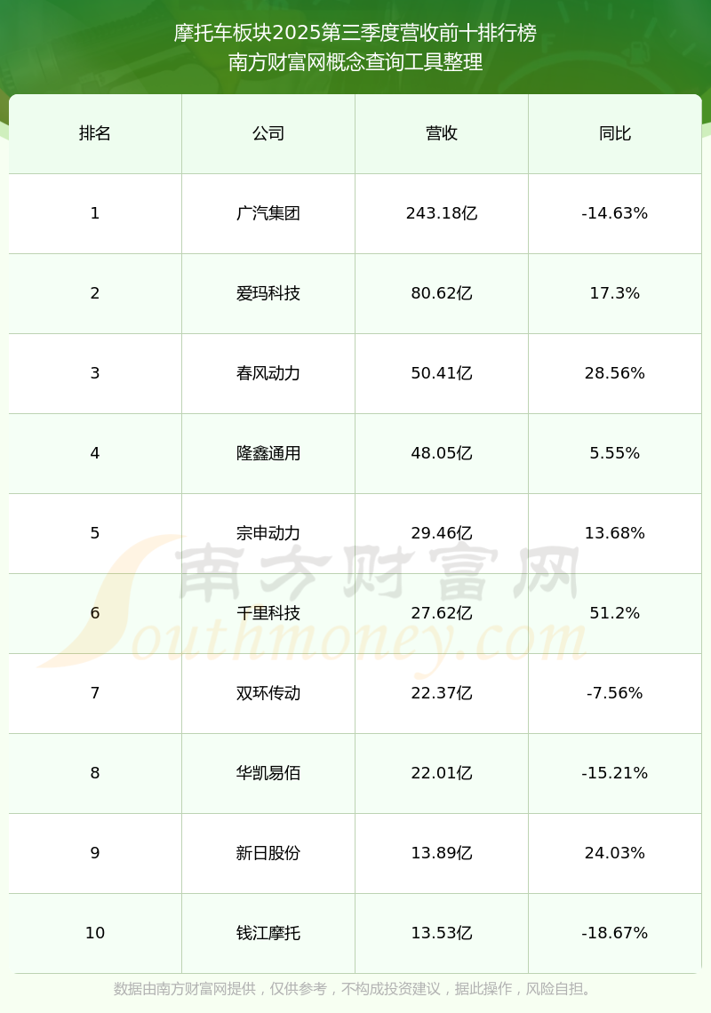 按照南方财富网概念查询工具统计,该股所属板块为摩托车板块,该板块共有21只股票,上汽集团2025第三季度营收在该板块中排名为第21名,该板块2025第三季度营收排名前十的股票如下表: