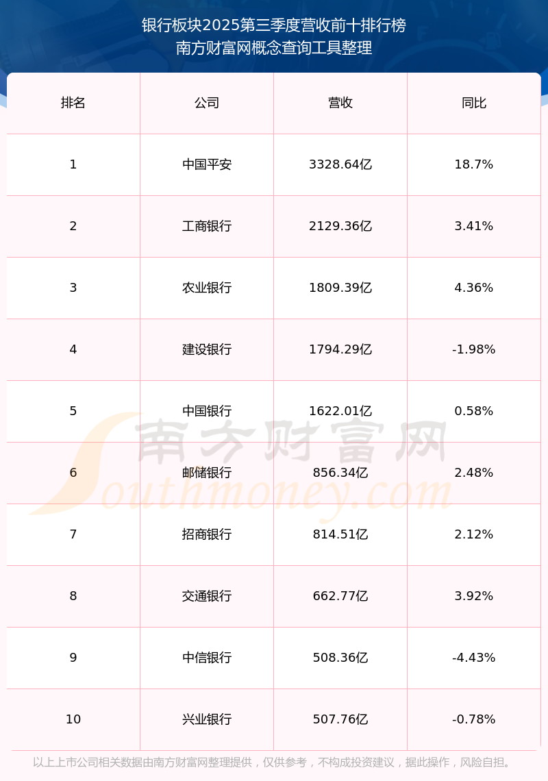 按照南方财富网概念查询工具统计,该股所属板块为银行板块,该板块共有44只股票,瑞丰银行2025第三季度营收在该板块中排名为第40名,该板块2025第三季度营收排名前十的股票如下表:
