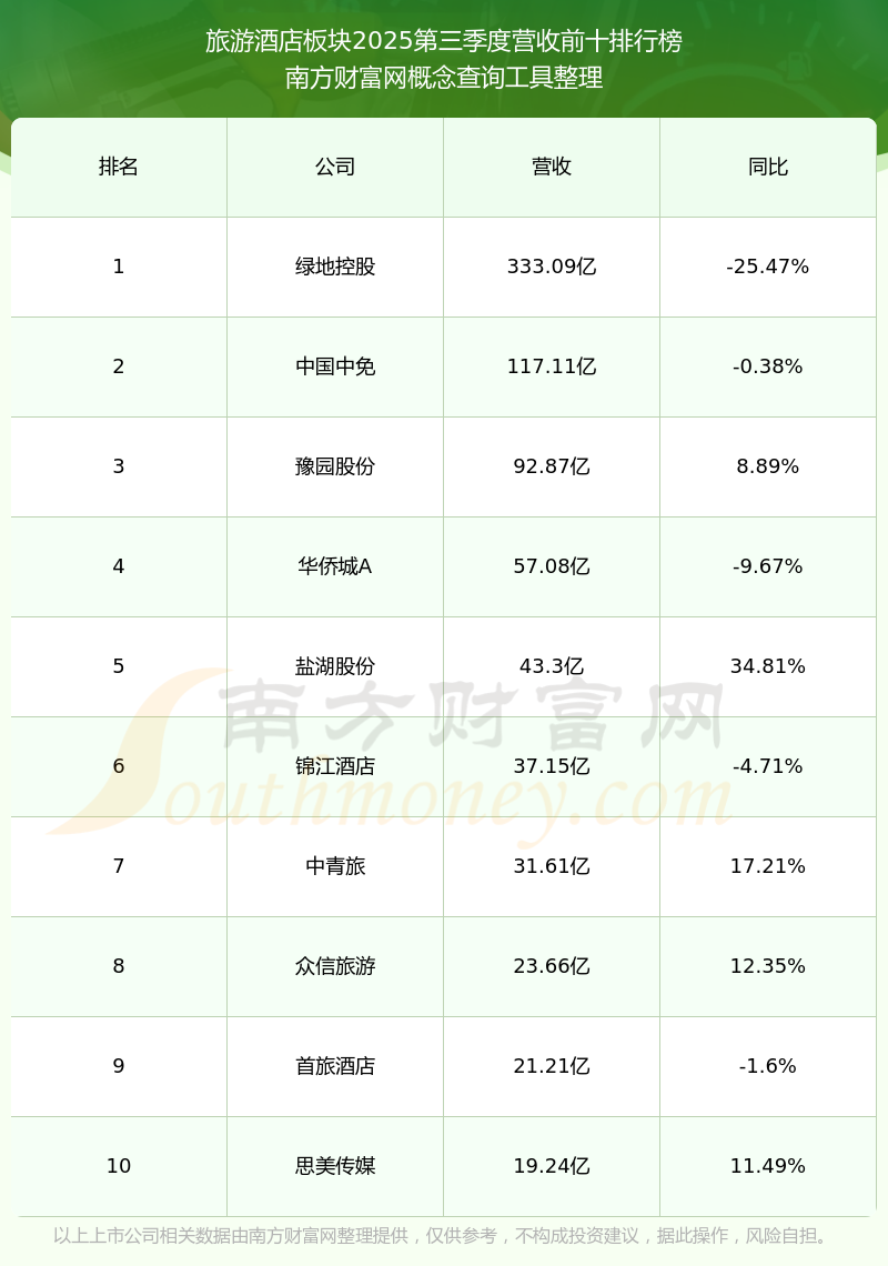 按照南方财富网概念查询工具统计,该股所属板块为旅游酒店板块,该板块共有69只股票,大连圣亚2025第三季度营收在该板块中排名为第36名,该板块2025第三季度营收排名前十的股票如下表: