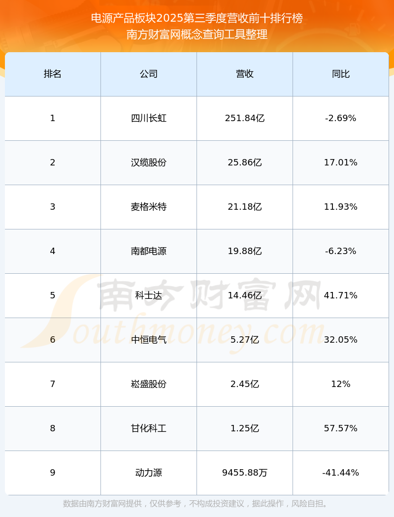 按照南方财富网概念查询工具统计,该股所属板块为电源产品板块,该板块共有9只股票,四创电子2025第三季度营收在该板块中排名为第9名,该板块2025第三季度营收排名前十的股票如下表: