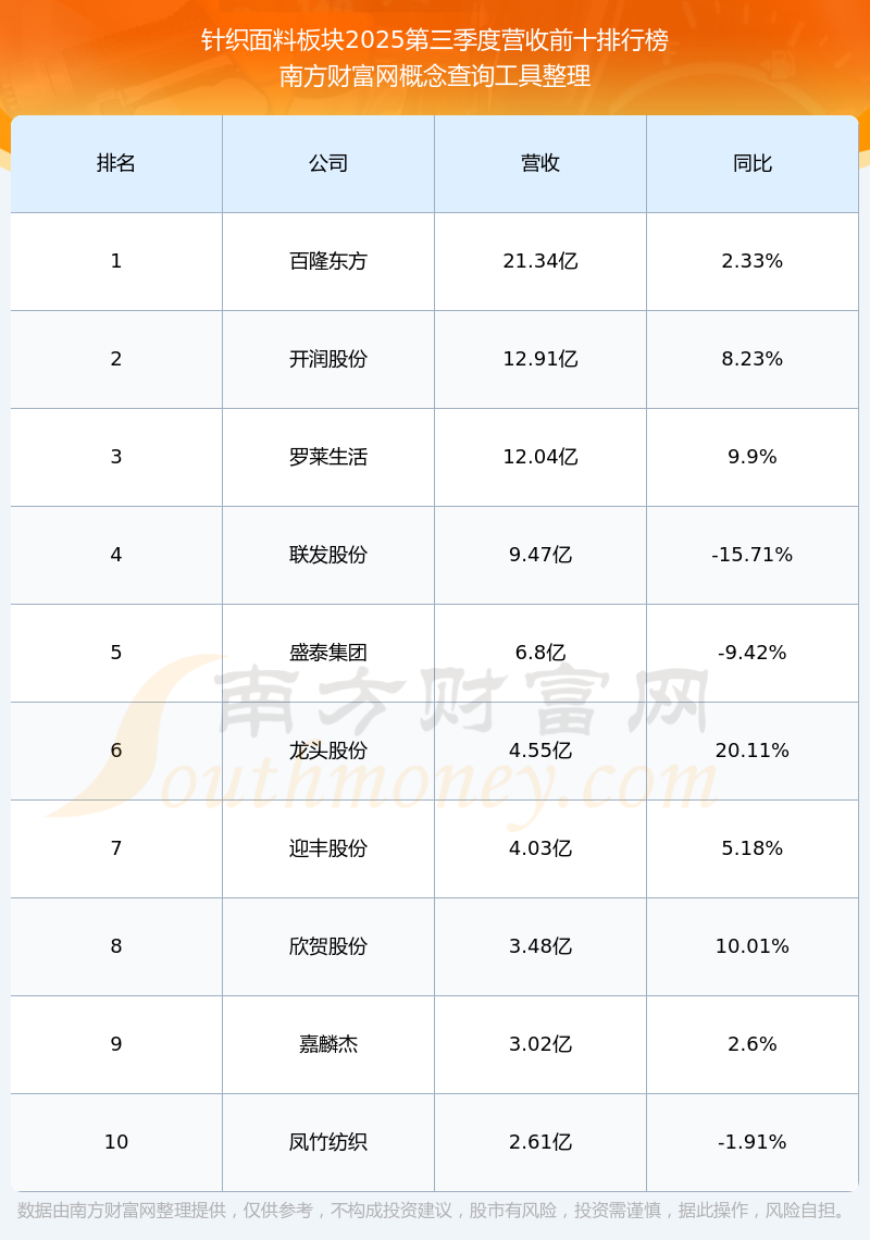 按照南方财富网概念查询工具统计,该股所属板块为针织面料板块,该板块共有13只股票,盛泰集团2025第三季度营收在该板块中排名为第5名,该板块2025第三季度营收排名前十的股票如下表: