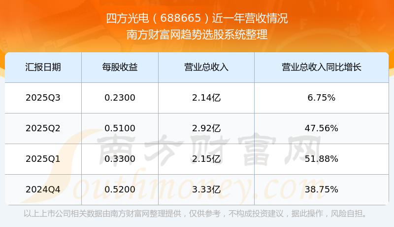 在2025年第三季度,四方光电的业绩表现,主营业务收入达到2.14亿元,实现了6.75%的同比增长率。同时,公司归母净利润录得2311.26万元,同比增长14.39%。
