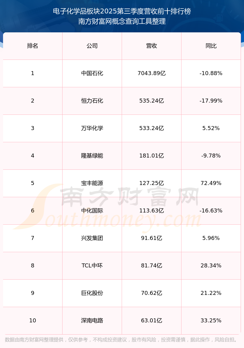 按照南方财富网概念查询工具统计,该股所属板块为电子化学品板块,该板块共有71只股票,三孚新科2025第三季度营收在该板块中排名为第71名,该板块2025第三季度营收排名前十的股票如下表: