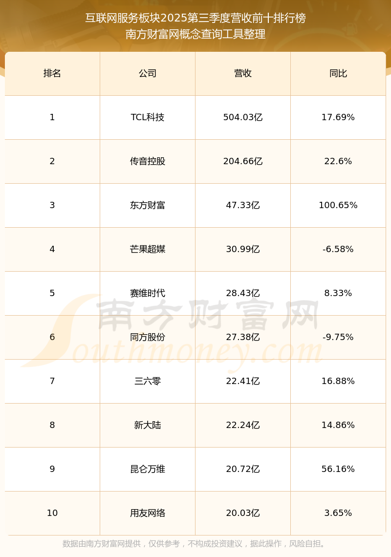 按照南方财富网概念查询工具统计,该股所属板块为互联网服务板块,该板块共有51只股票,金桥信息2025第三季度营收在该板块中排名为第51名,该板块2025第三季度营收排名前十的股票如下表: