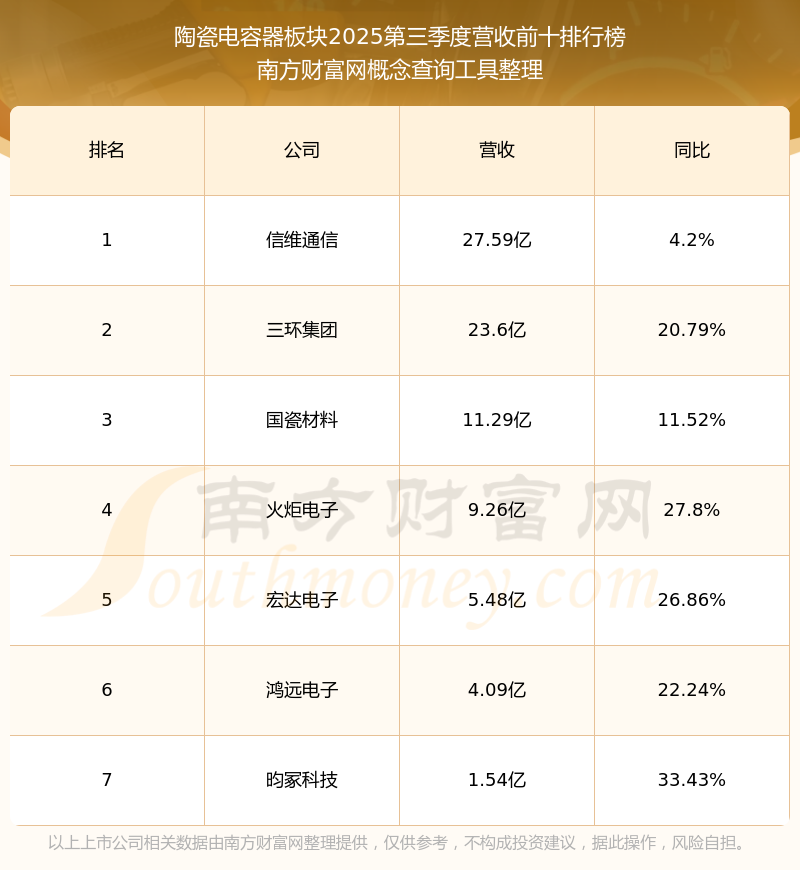 按照南方财富网概念查询工具统计,该股所属板块为陶瓷电容器板块,该板块共有7只股票,火炬电子2025第三季度营收在该板块中排名为第4名,该板块2025第三季度营收排名前十的股票如下表: