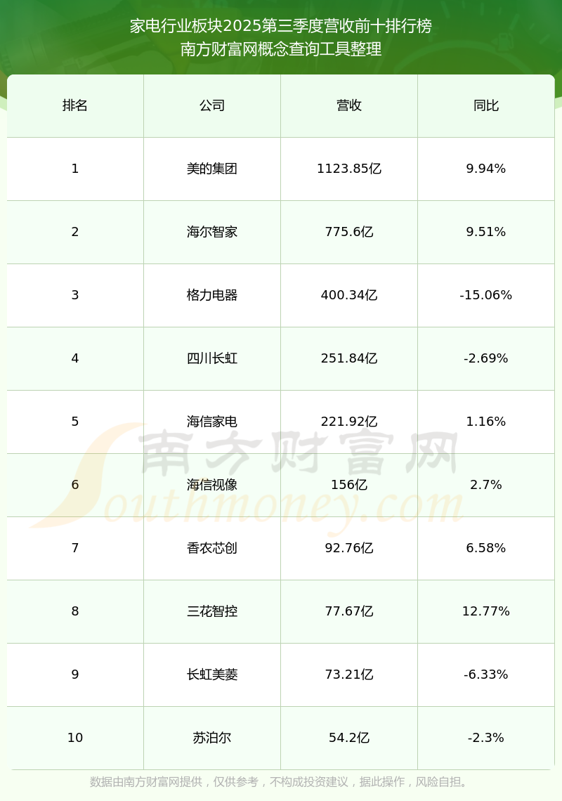 按照南方财富网概念查询工具统计,该股所属板块为家电行业板块,该板块共有64只股票,海尔智家2025第三季度营收在该板块中排名为第2名,该板块2025第三季度营收排名前十的股票如下表: