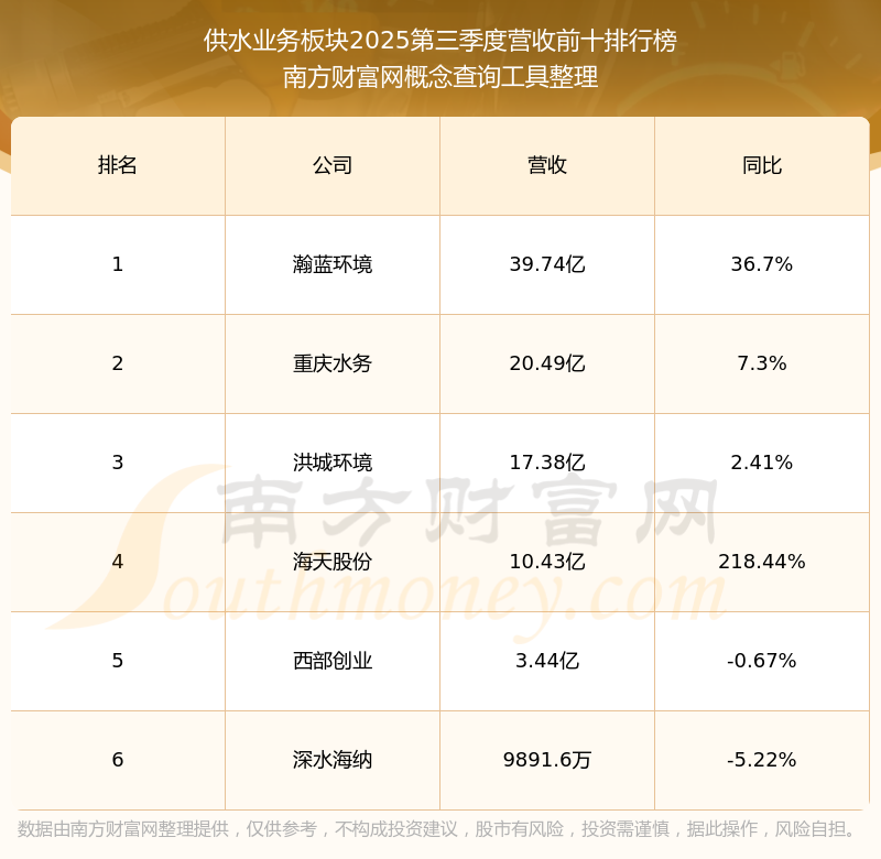 按照南方财富网概念查询工具统计,该股所属板块为供水业务板块,该板块共有6只股票,海天股份2025第三季度营收在该板块中排名为第4名,该板块2025第三季度营收排名前十的股票如下表: