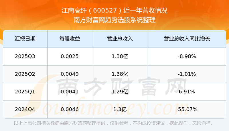 江南高纤2025年第三季度公司实现营业收入1.38亿元,同比-8.98%;归母净利润438.61万元,同比-55.22%。